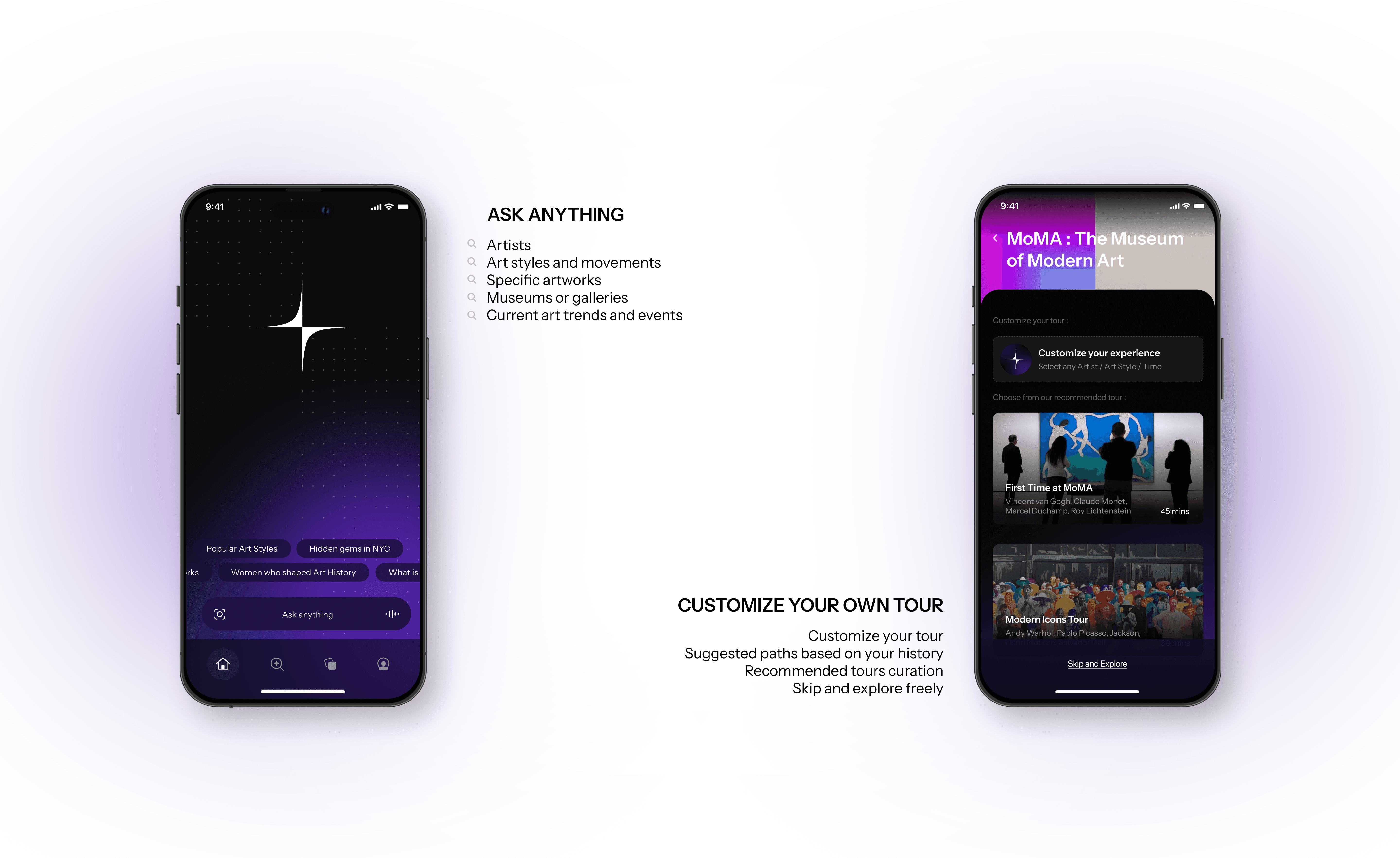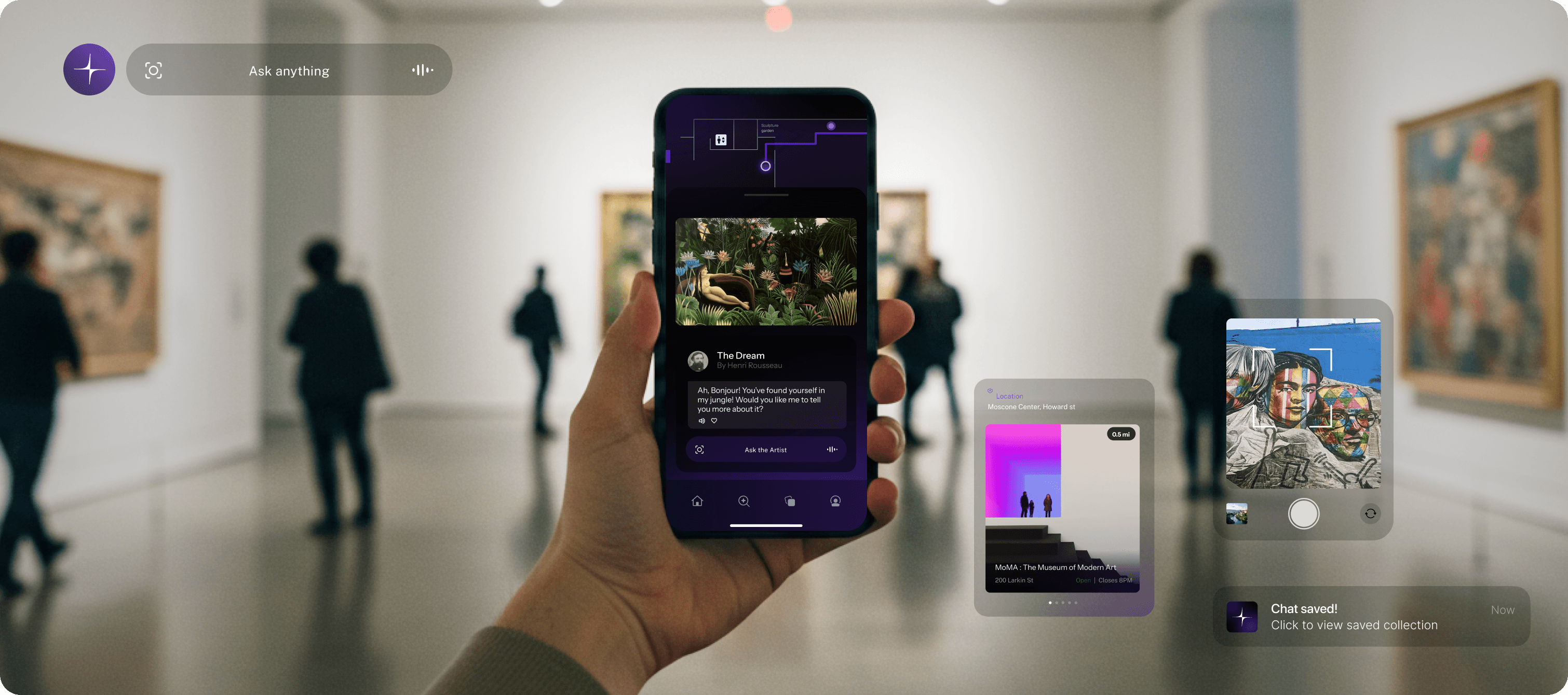 Shows your current location with nearby artworks in a swipeable carousel. Pull the map down for full view. ‘Ask Anything’ search sits above the nav bar, ready for spontaneous curiosity.