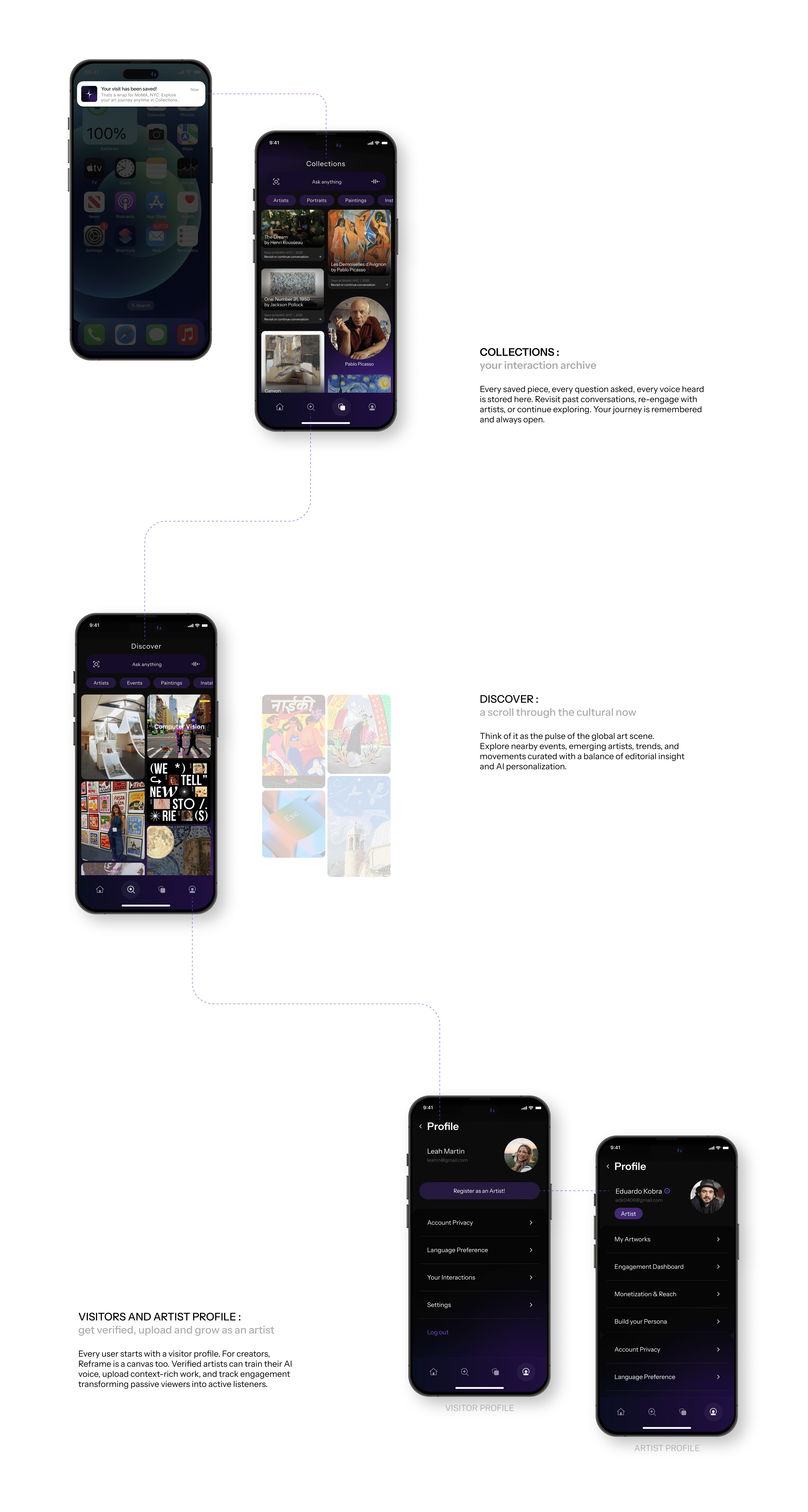 Art stays quiet until you are ready. Once you near a piece, the app gently activates: the interface transforms, the artist introduces themselves, and interaction becomes inevitable.